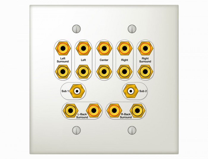 The Home Theater Plate (HTP-2) is a double-gang in-wall connection plate designed to allow easy hookup of all the speakers in a 5.1, 6.1 or 7.1-channel surround sound system. It includes terminals for up to seven speakers, and two powered/active (low level) subwoofers. The heavy-duty molded plate supports the weight of high-quality wires, and each connection is clearly labeled. The 7/16” gold-plated binding post hex nuts make for easy and secure connections, and the captured posts won’t turn while they are being tightened. The 5-way binding posts have gold plating to resist corrosion and can accept the following: bare or tinned wire up to 12 gauge in thickness, pins, spade lugs, and single or double banana plugs.