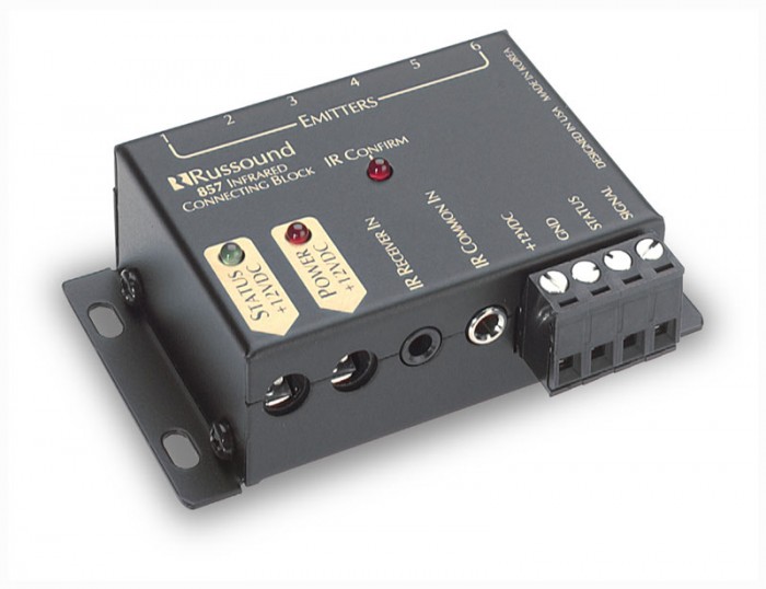The 857 supports up to six components using Russound 845.1 single IR emitters or up to 12 components using Russound 1584.1 dual emitters. It provides a convenient detachable screw connector for wiring multiple IR receivers such as the Russound 858 and 862. It also includes jacks for a Russound 854 tabletop receiver and a common IR signal from a multiroom system.
