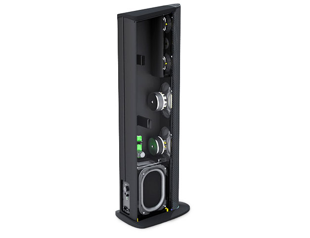 The sleek, 48" tall Triton Two+ is newly updated to now incorporate many of the new technologies and refinements developed for the Triton One, including: a fully balanced crossover design, high-end film capacitors, redesigned midrange/upper-bass drivers, and a reprogrammed DSP. Its built-in subwoofer section is powered by a 1200 watt GoldenEar ForceField digital amplifier driving two 5" x 9" front-mounted quadratic subwoofer bass drivers coupled to dual opposing side-mounted, inertially-balanced, 7" x 10" quadratic planar infrasonic bass radiators. The two 4-1/2" spider-leg cast-basket midrange/upper bass drivers, which incorporate GoldenEar’s proprietary Multi-Vaned Phase Plug (MVPP™) design, are housed in dual discreet chambers arranged in a D’Appolito array surrounding GoldenEar’s extraordinary High-Velocity Folded Ribbon (HVFR™) tweeter design. The Triton Two's dynamic, effortless, you-are-there clarity will almost literally put the live performance or action right into your home, or conversely, put you into the concert hall or the live action on the screen.